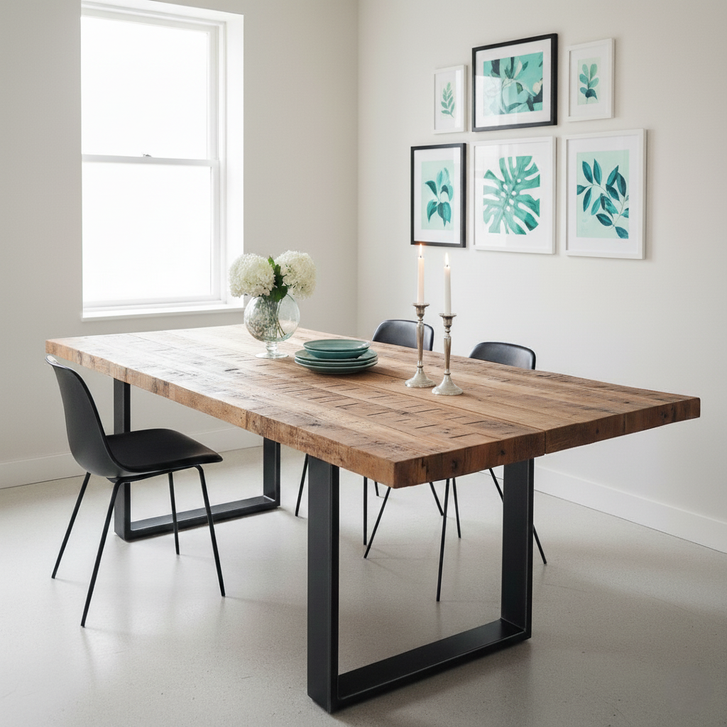 This elegant dining room table blends modern sophistication with the charm of reclaimed materials, making it a stunning centerpiece for any home. Its versatile design complements both rustic and contemporary interiors, bringing warmth, character, and sustainability to your dining space. Choose this Handmade Modern Reclaimed Wood Dining Table to elevate your home with timeless beauty and eco-conscious craftsmanship.